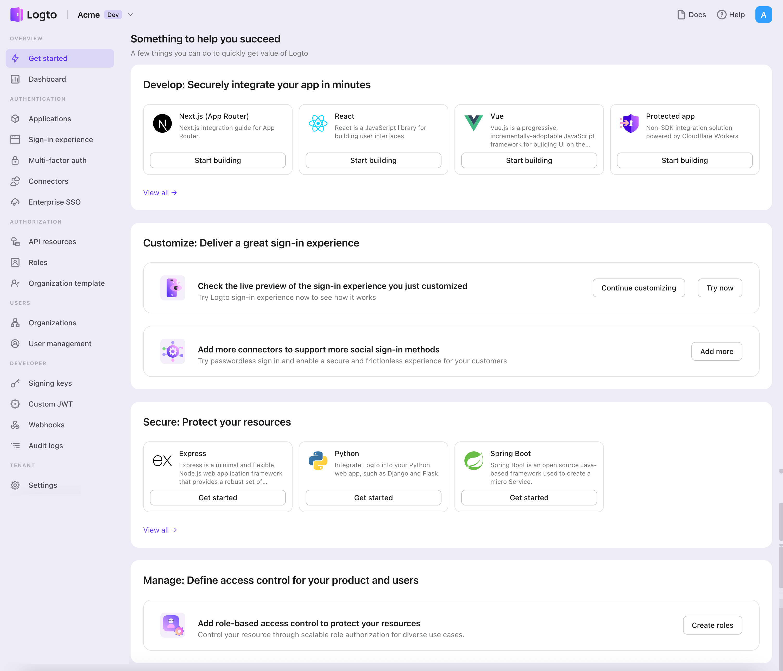 We recommend starting with a free development tenant on Logto Cloud. This allows you to explore all the features easily.