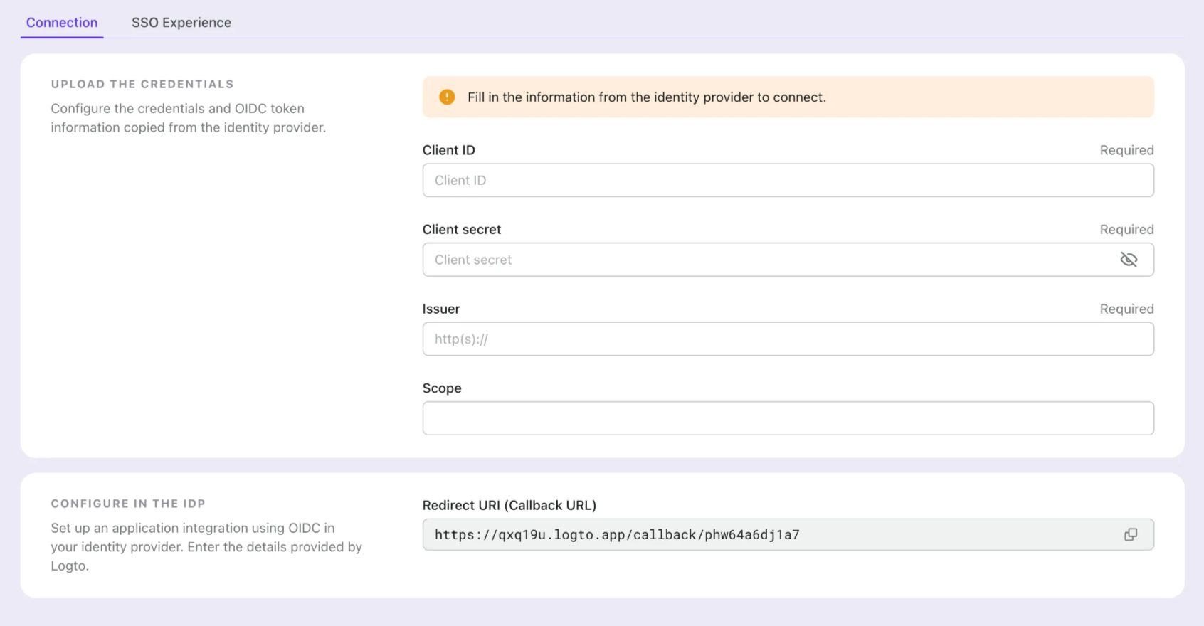 Navigate to the Connection tab. Logto provides three different ways to configure the IdP metadata: