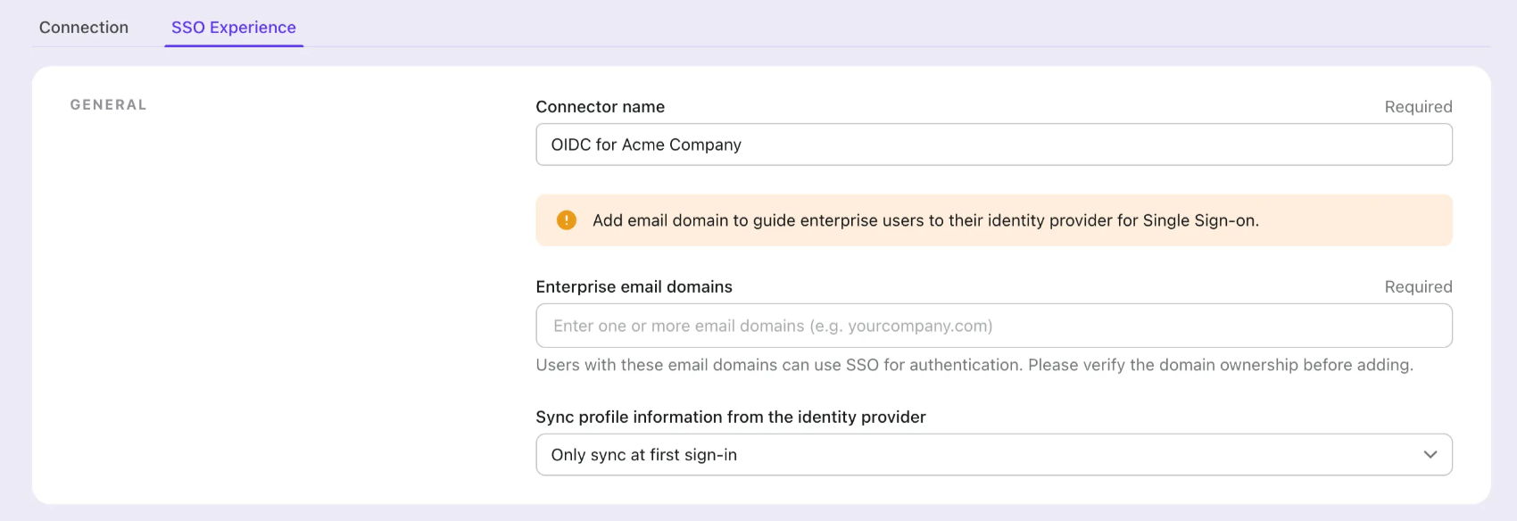 Provide the email domains of your organization in Logto’s connector SSO experience tab. This will enable the SSO connector as an authentication method for those users.